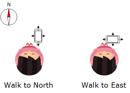 どうやら、いわゆる歩きスマホ状態を想定して、進行方向を決めているようです。